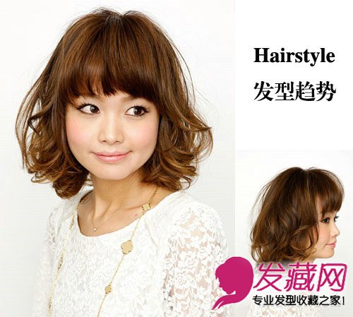 编辑点评:这款蓬松及肩发型与第一款相比少了一些清爽感,但齐刘海的设计是扮嫩不二选择,蓬松感更强有时会更加的抢眼。