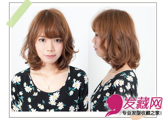 卷发波波头特别的烫发设计为发型增添可爱的气息,及眉的刘海缩短脸型长比例,适合长脸女生。