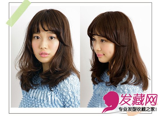 内扣的斜刘海搭配中卷发修颜瘦脸,而巧克力色头发提升时尚感。