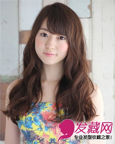 披肩大波浪长卷发,刘海斜梳,甜美的笑容,让人尽显俏皮活力,棕色染发,更是打造出活泼可爱少女味道。
