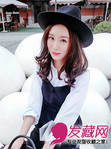 日系的中卷发发型,少发量的女孩,烫出丰盈的卷发,不仅显得饱满时尚更能很好的修颜,衬衫背带裙,黑色的礼帽,打造气质名媛。