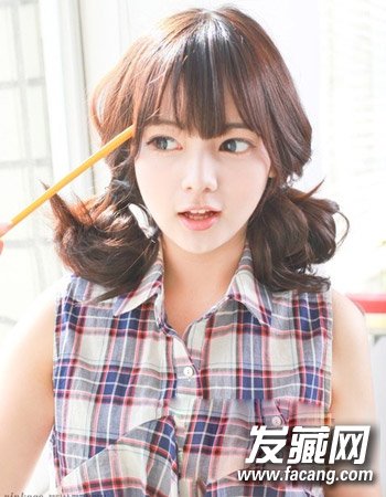 可爱的蓬松双花苞头扎发发型,韩式刘海凸显出清新与灵动感,清爽的扎发发型可以完美的展现出小脸,精致而且饱满。