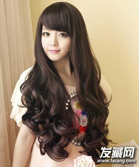 5、韩式斜刘海修颜显甜美,是很多女生喜欢的刘海类型,而大波浪长卷发则充满了浪漫气息,整款发型带来了较为明显的厚重感,和圆脸搭配也颇有一番味道。