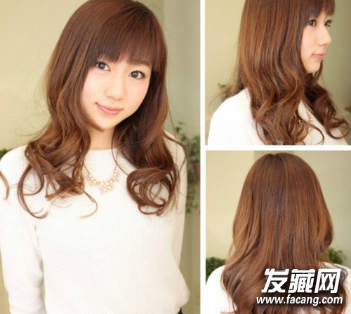 弧度感的斜刘海,轻轻松松修饰过宽额头以及脸颊,大波浪烫发,为头发注入空气,整个人的气质可爱起来。