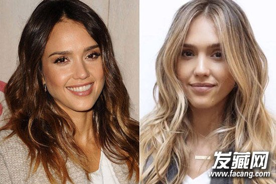 jessica alba原本的发色偏深了,能起到瘦脸的效果,但是头发的卷度比较凌乱,经过打理之后,脸颊两侧的头发向内微卷,形成自然的波浪,既增加甜美感,又有很好的瘦脸效果。