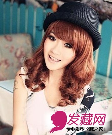 质感丰盈的女生甜美梨花头发型,半圆的刘海设计很好缔造女生温婉气质,从耳迹开始的大卷弧度一点点过渡到小卷,简单黑色小礼帽的搭配时尚显范。
