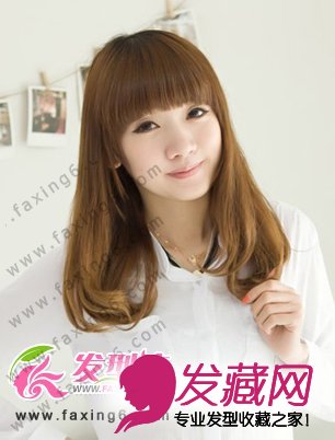 瘦脸最佳的中长梨花头,将中长发做出内扣状就形成了一个梨花烫发型,棕黄色的染发时尚有能衬托白皙的皮肤,搭配齐刘海整体营造出一个甜美有时尚的造型。
