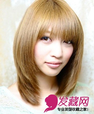 内扣的C型中长直发能拯救你的大脸,薄薄的刘海的让脸型更加的小巧,金棕色的染发时尚吸引人,一款很靓丽的直发梨花头哦!