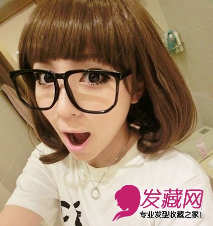 卡哇伊的动漫童鞋,长款的梨花烫内扣发型,盖住额头的刘海,配搭黑色大框眼镜,灵动可爱,青春无比,最适合90后美眉卖萌。