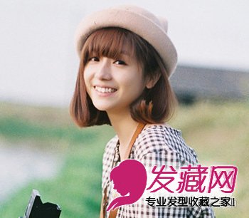 内扣的齐刘海,黄棕色的染发,将一边头发收在耳后,格子衬衫搭配一款女士帽子,让这款短发梨花头发型尽显小女生的甜美气息。