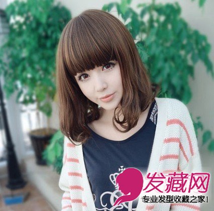 棕色的齐刘海梨花头,大片的齐刘海遮盖住眉毛。可以凸显出你的小脸。