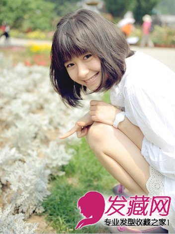 比较散碎的齐刘海搭上略显凌乱的内扣中短发发型,就是一款清纯系的短发梨花头。生动甜美的笑容以及白色纯美的裙子,都是这款造型的亮点所在。
