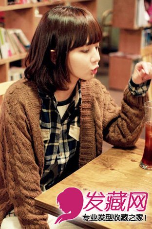 齐刘海的短发梨花头。一款很具有韩国女生风格的短发。巧克力色的染发效果,更为这款短发增添了不少时尚的感觉。配上格子衫和毛衣外套,即休闲又百搭。