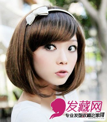 栗色的染发让头发柔软有光泽,隐约流露出一种低调的华丽感。厚重摆满的斜刘海具有很好的修颜效果,将五官显得更突出。发尾采用的小梨花头内扣,尽显女生的清纯俏皮,也是减龄必备的哦,加上蝴蝶结的发箍,更是甜美可爱了。