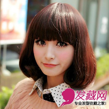 齐刘海的短发梨花头,内扣的染烫发卷度做得非常的好看。配上棕红色的染发颜色,绝对是韩系甜妞一个。此款发型还非常的适合大脸肉脸的女生哦!