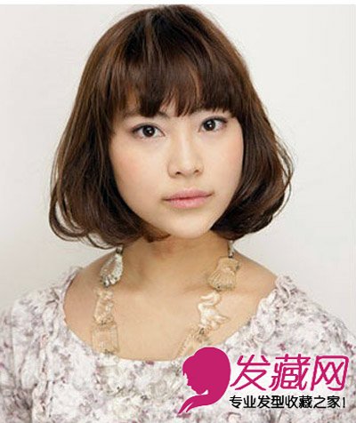 齐刘海搭配上内扣式的弧度,加上烫发的感觉,霎时间变得更为迷人。深色的染发造型能够将肤色变得白皙之余,也增加气质。