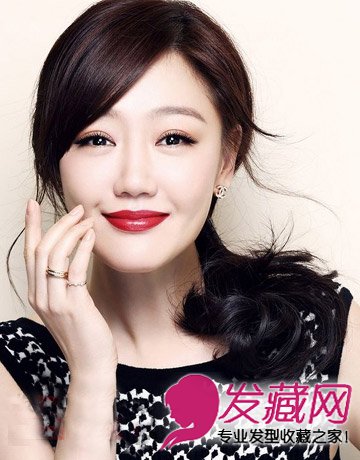 侧边低扎发是很多轻熟女喜爱的发型,有质感的发丝在一边扎一个简单的马尾辫斜搭在一边,搭配刘海发型,充满魅力的一款魅力发型。