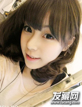 温柔的卷发发型,更容易藏起肉肉脸哦,内扣的韩式卷发加上栗色染发,清新又迷人,薄薄的齐刘海更显年轻少女气息。