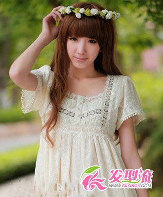 微卷的长发突显出蓬松空气感,随意披散在肩头,营造出飘逸动感的气息。时尚的栗色染发显得大气柔美,头顶花环的搭配犹如花仙子般美丽。一袭白色的长裙更加显得甜美乖巧。