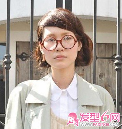 个性分明的“二八”斜分,头发整齐的在额头,可以起到修饰长脸型的效果,搭配上复古的盘发和圆形复古镜框,文艺调调女生最爱。