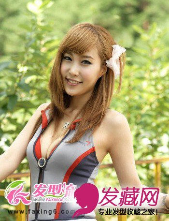 棕黄色的染发流行抢眼,齐肩的直发发型又有着清纯的美感,斜分刘海展现出有神的眼睛,搭配露乳的服饰,性感娇艳。