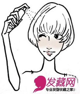 基本完成后切勿忘了用定型喷雾整体定型。切忌用喷雾与刘海平行喷洒,这样既容易破坏刘海的造型,又容易喷洒过量。应维持45度角均匀喷洒,用另一手手心挡住额头,让定型水雾落在刘海上,再用手按压需要造型的部位即可。