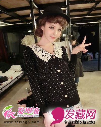 依旧以内收的方式打造刘海,但是要求刘海如卷筒形状使中间成为空心的效果,圆筒内收的卷发刘海别致而魅力,配上小礼帽,美丽大方。