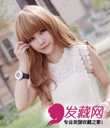 中长度的卷发发型,在发尾处制造出微卷曲的效果,优雅的小女人气质十足,厚重感的齐刘海发型,增加了这款卷发发型的萝莉可爱感,浅棕色的染发颜色,令这款齐刘海卷发发型更显时尚洋气。