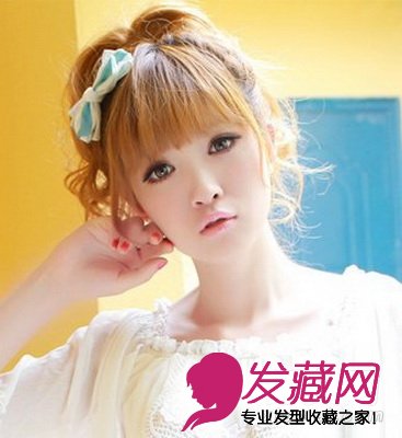 青春活力的马尾造型,让女生倍显年轻活力,卷发的马尾发型,更具有时尚自然的韵味,融入金棕色的染发颜色,衬托出女生更加白皙的肌肤,齐刘海发型的打造,搭配蝴蝶结发饰,甜美无暇。