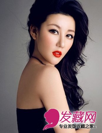 小眼睛适合什么刘海:大气丰盈的浪漫卷发,落在肩膀的一侧,与红色的唇色相对称的黑色长发,气质中散发优雅。