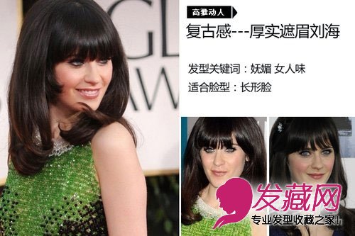这种厚实感复古遮眉刘海既不挑发色(反而深色系发色更有神祕感),更不挑长短,还能依照每个人脸型修改适合的样貌,相当推荐给发量丰盈的女孩们尝试。而这款刘海的代表人物就是时尚怪怪女星柔伊黛丝香奈Zooey Deschanel了!