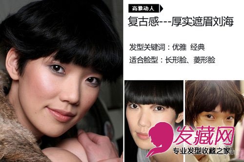 短发厚实遮眉刘海也很耐看,带着一股文艺青年的复古感,而且经典流行;而搭配长发,则让人觉得充满了温柔的女人味,对于上额偏窄的MM,很适合尝试这种刘海呢。