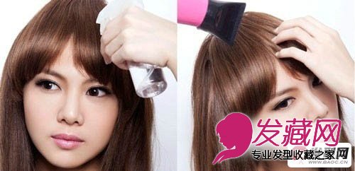 齐刘海发型第六步:我们先将不顺的头发弄湿,然后用吹风机将头发吹的蓬松点。