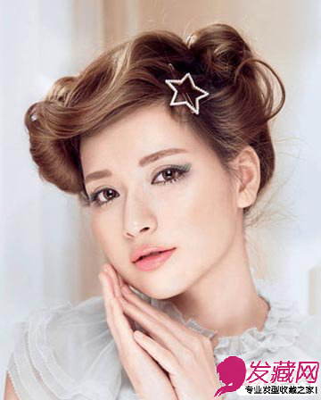 一款时尚甜美的发型,其中带着一丝复古的气息,非常吸引人。将长刘海在前额打造出蓬松的弧度,非常华丽,在薄厚盘成一个发髻,简单中流露出甜美的气息,非常迷人。