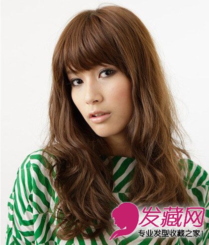 编辑点评:这款齐刘海卷发很适合瓜子脸MM。斜刘海遮住了整个额头,这样让脸的下半部显得更加小巧精致。耳朵旁的头发随意内外卷曲,一直延伸到胸前,拉伸了脸部线条,更加丰满了面部。