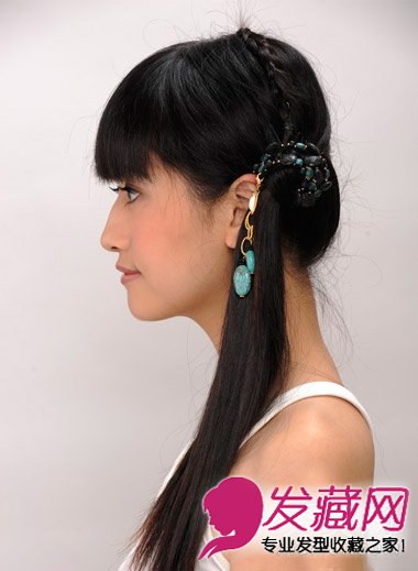 在这款齐刘海发型扎法中还加入了辫子造型,让整款造型更显别致。
