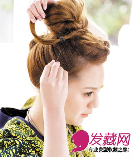 step3:最后将刘海编出的辫子缠绕花苞头,发尾用黑色发夹固定,这款刘海编发也完成啦。
