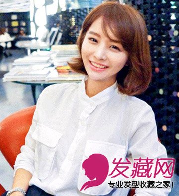 同样是韩范十足的一款女生中短发发型,发梢做成的一个大的内扣形式再配合温暖的棕色染发,而偏分的刘海造型更增添女性的温柔感,比较适合轻熟女的OL一族。