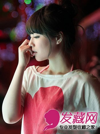 俏皮可爱的韩式齐刘海,层次感十足的刘海发型设计,搭配深棕色的染发,简单扎发髻的造型甜美清新。