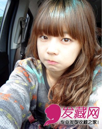 棕色的长卷发,呈现出时尚的感觉,将头发撩到一边,显得非常可爱,搭配空气感的齐刘海,修饰了脸型,展现出萌妹子的形象,十分的讨人喜欢。