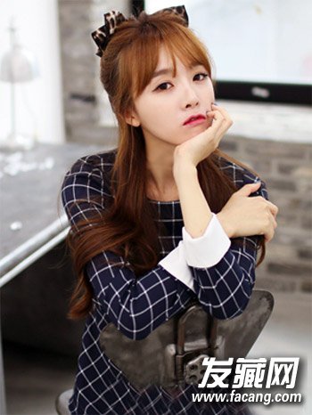 长发MM都会打理的一款气质韩国女生发型,蓬松的长发扎简单的公主头半扎发,配合空气刘海修饰脸型,搭配发饰,甜美清新的街拍发型。