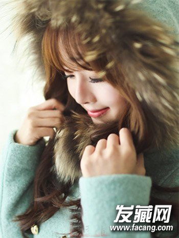 这款齐刘海蓬松长卷发是冬季女生最爱的一款温暖系发型,蓬松的波浪发卷自然卷曲,柔顺的披肩发很适合戴帽子,温暖指数瞬间UP!