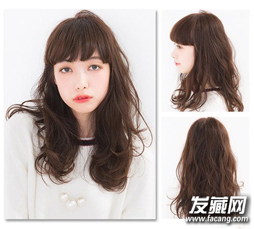 巧克力色蓬松长卷发慵懒感中带了点小性感,180度的齐刘海能够很好地展现整个脸型。