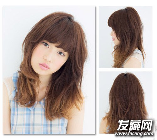 棕色渐变浅棕的中长发发型,微卷发尾显得蓬松丰满,齐刘海能够起到一定的小脸作用。