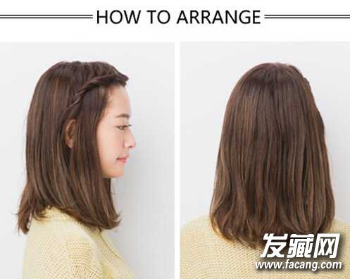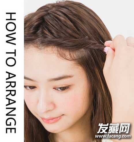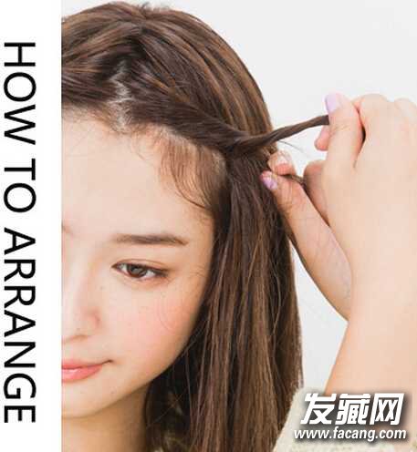 step 2:刘海处取一小束头发,分成两部分进行扭转向后靠,到耳朵上方停住。