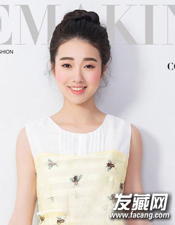利用的是简单的无刘海造型设计来彰显女生五官的精致与脸型的小巧感,而配合同样是清新自然的乌黑发色与高耸的花苞头扎发更显青春活力风。