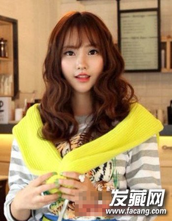 同样是清样的空气感刘海造型设计的一款时尚女生齐刘海中长发发型,低调的棕色染发彰显着小女生的文静感,与微显蓬松式的中长发烫发相搭更添可爱甜美风。