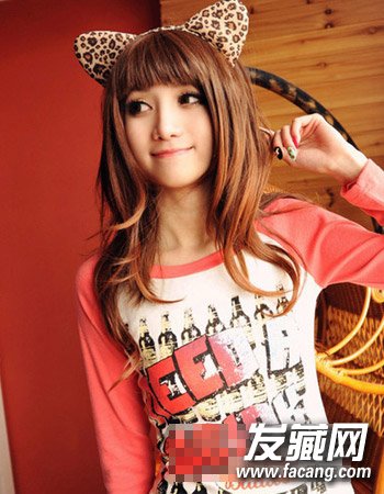 整齐而厚重的齐刘海造型设计与这种包裹住脸型的中长发造型设计可是有着十足的修颜效果哦,再配合这种温暖的棕红色染发与碎发形式的烫发设计更添可爱甜美风。