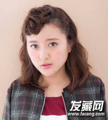 前额的刘海编成别致的发辫后固定在头顶,花朵造型的设计甜美吸睛。