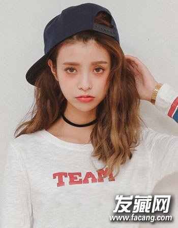 利用的是丰盈蓬松形式的中长发烫发造型设计来增添女生潮流气质感,而无刘海的露额造型设计与一顶运动型的帽子搭配更添十足街拍范儿。